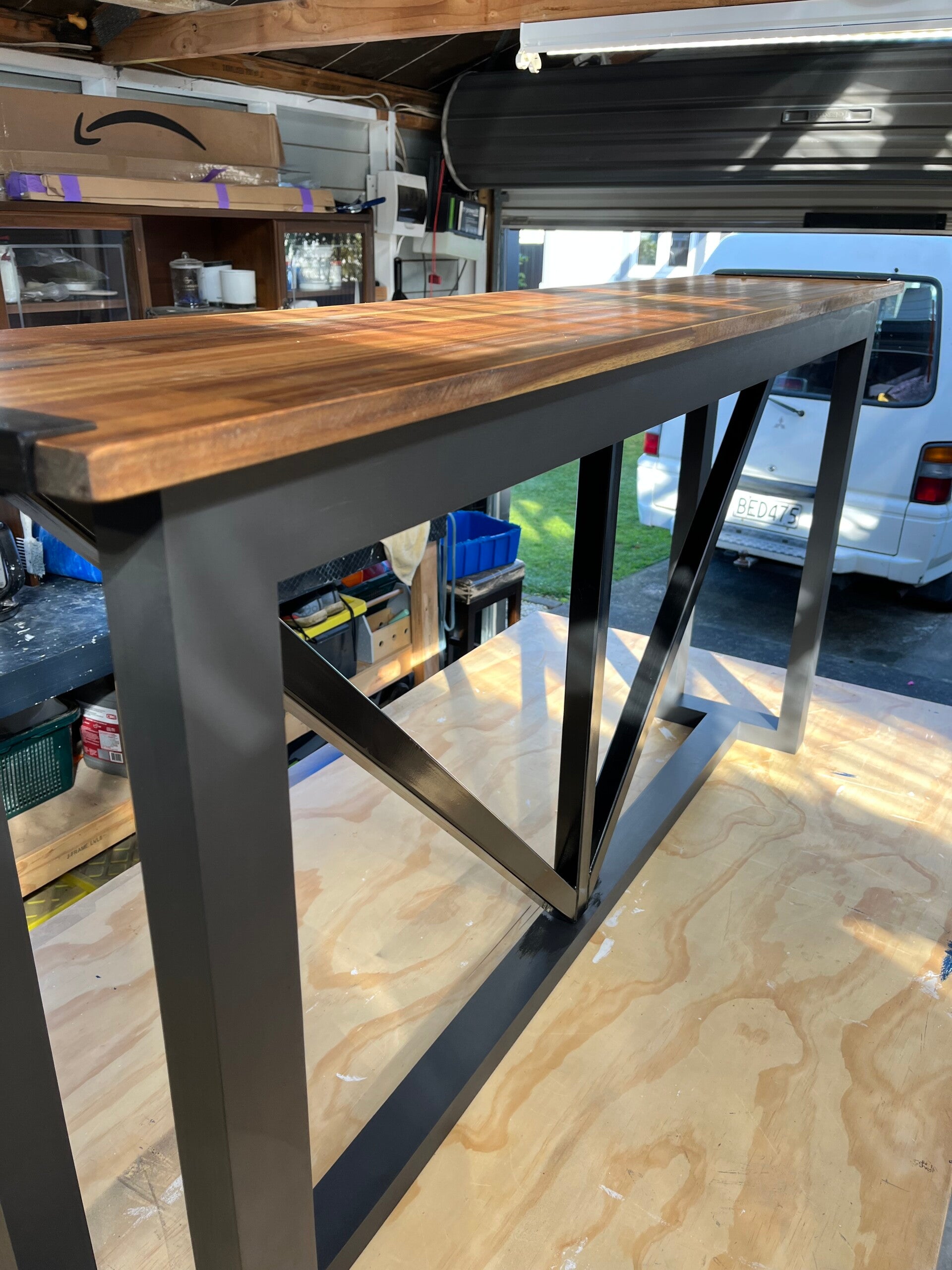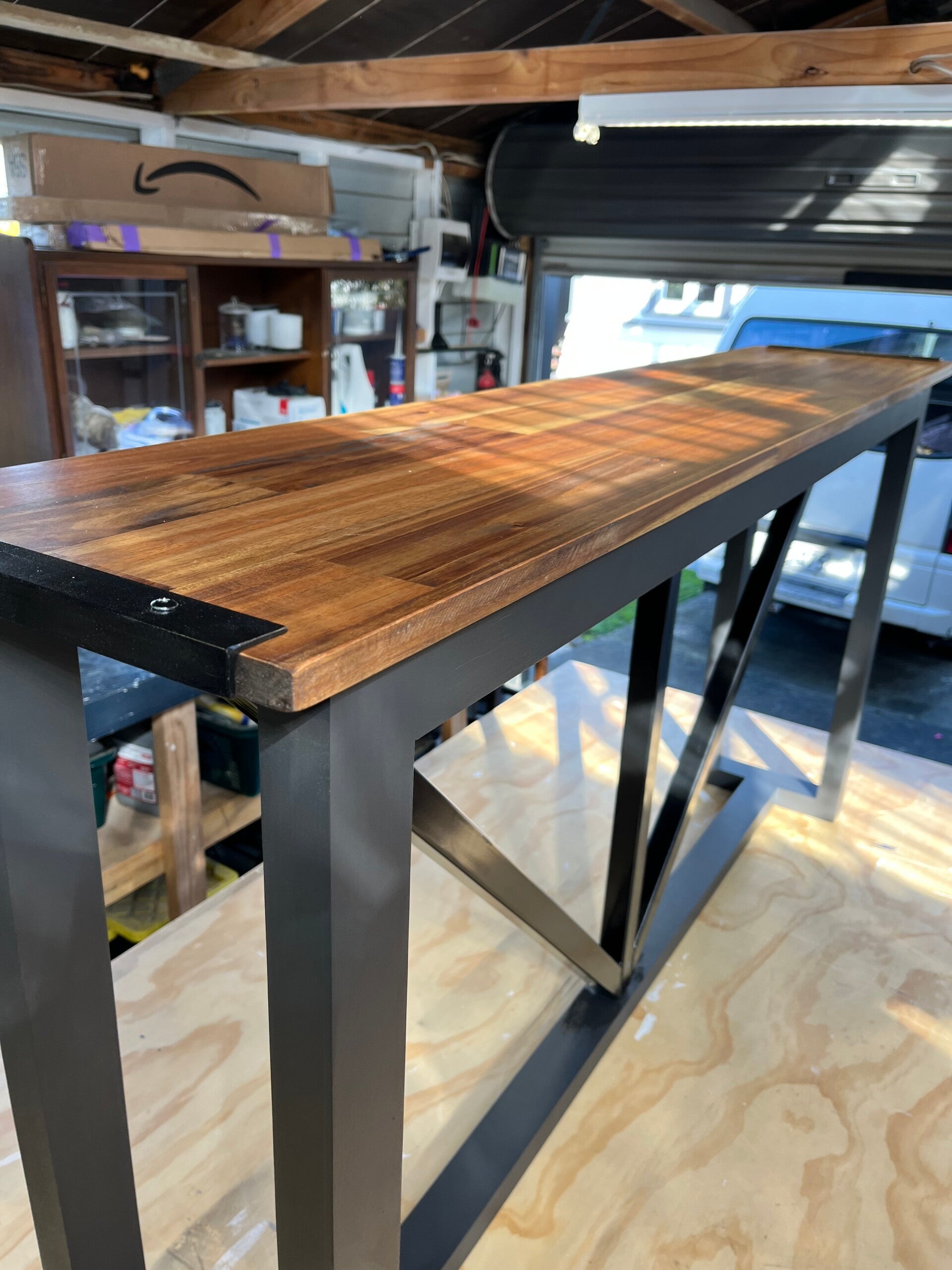 This hall table was a commission for an existing client, we were looking to get an industrial look by combining wood and steel, the girder support is made of steel while the rest is wood. The top was made to match her entertainment cabinet we made earlier.